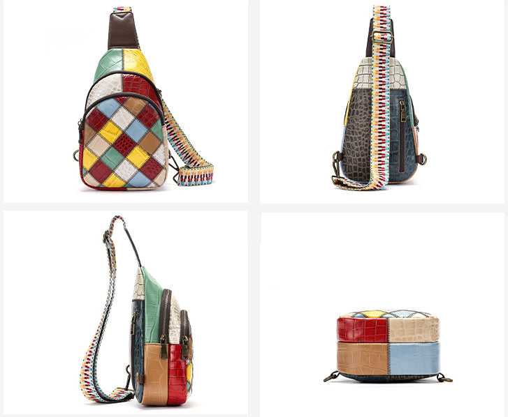 Women’s Bohemian Patchwork Leather Sling Bag Adjustable Crossbody Chest Bag