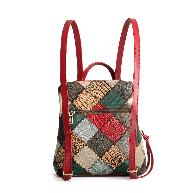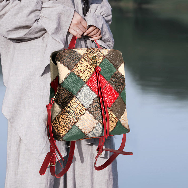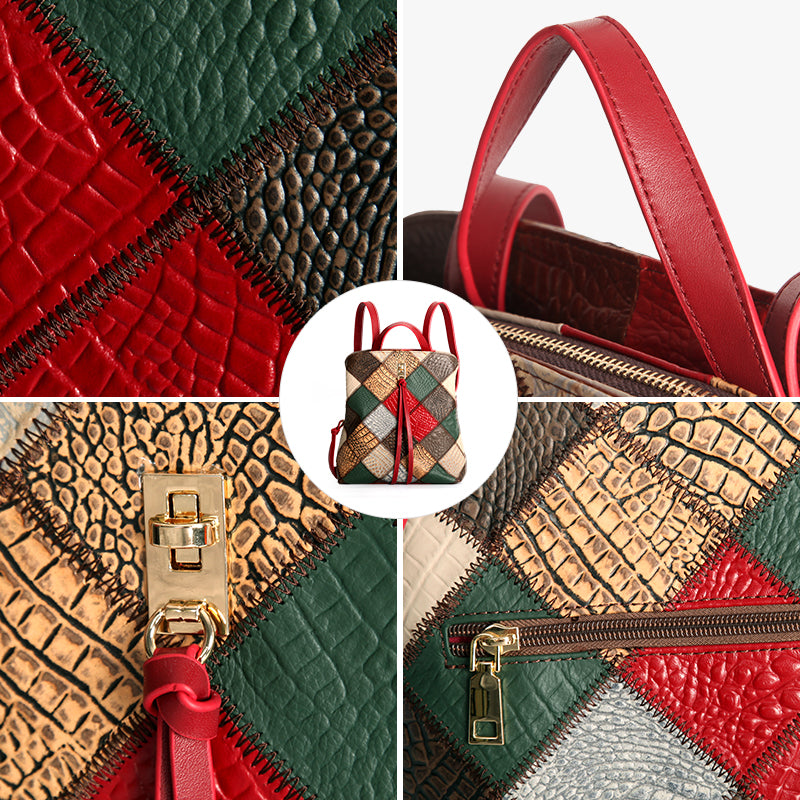 This women’s boho patchwork backpack purse is crafted from premium full-grain cowhide leather, featuring bold multicolor panels and a signature long leather tassel. A stylish blend of artistry, texture, and practicality.