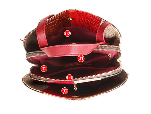 3 main compartments,1 interior zip pocket,1 slip pocket,Back zip pocket for quick access
