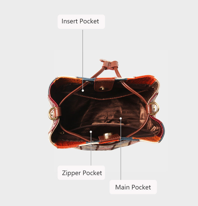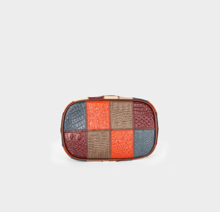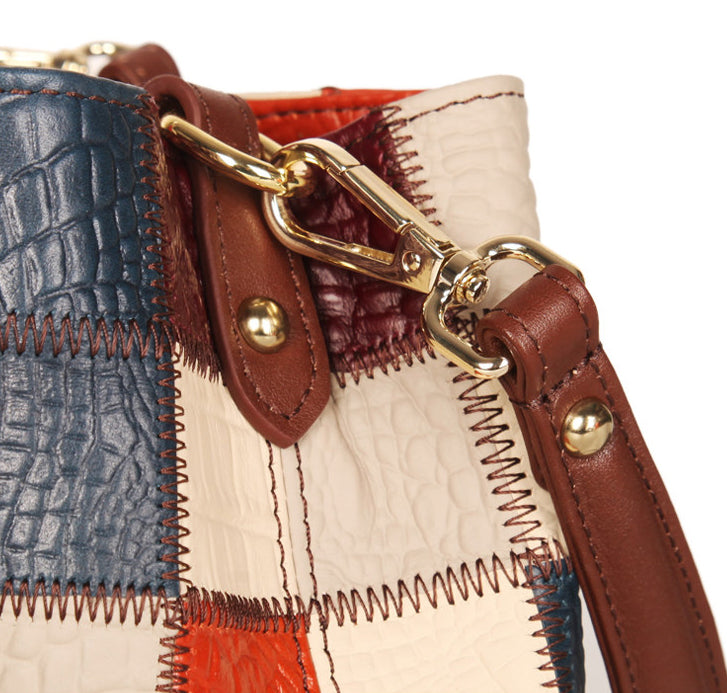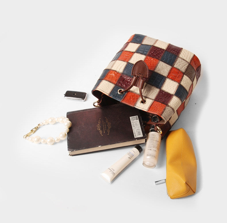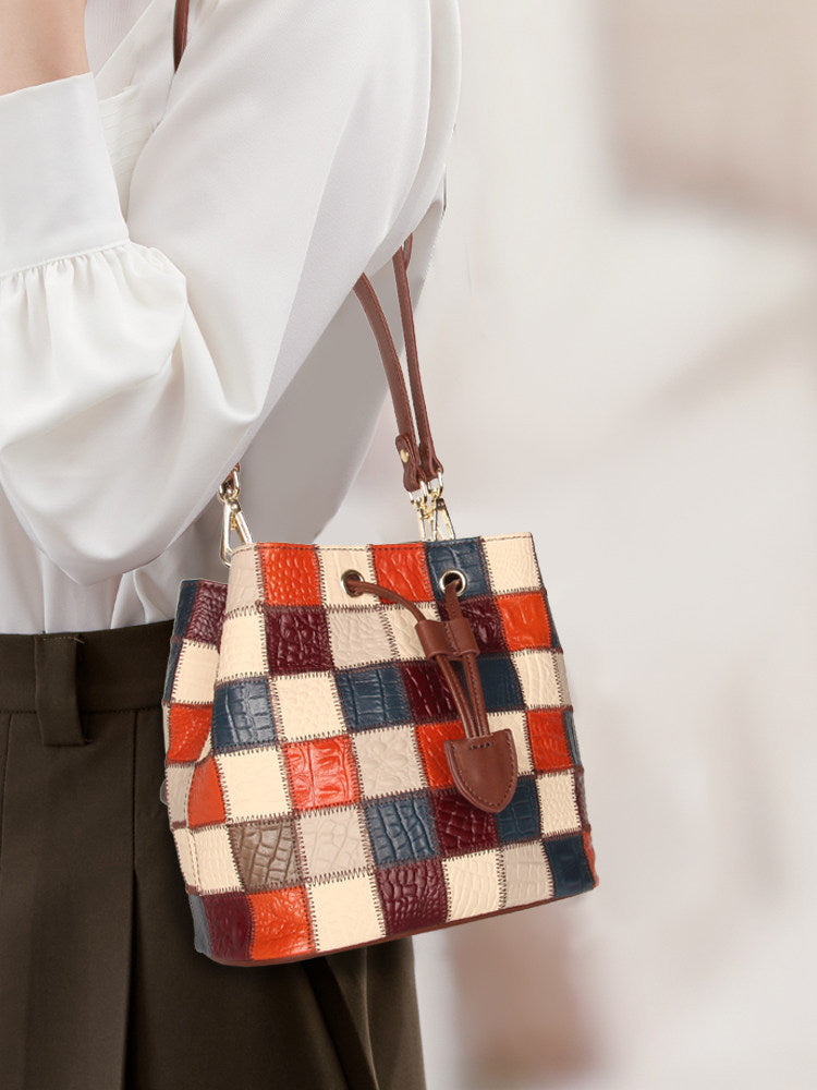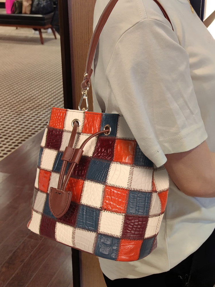 This small patchwork leather bucket bag combines a stylish color-block design with everyday functionality. Crafted from genuine top-grain cowhide, each bag features a unique mix of colors for a standout look.