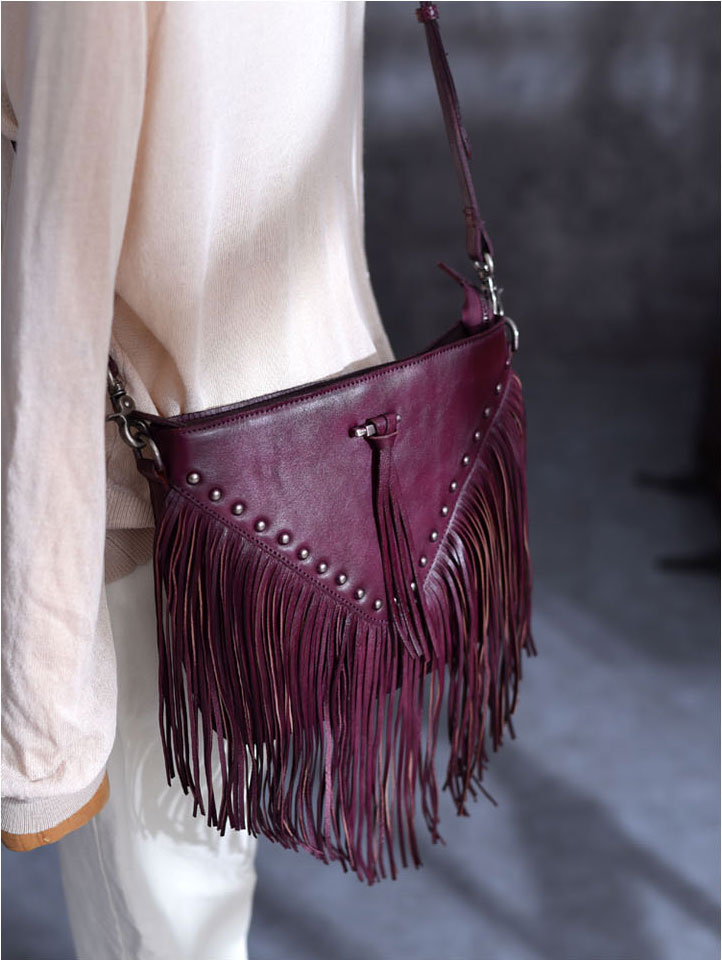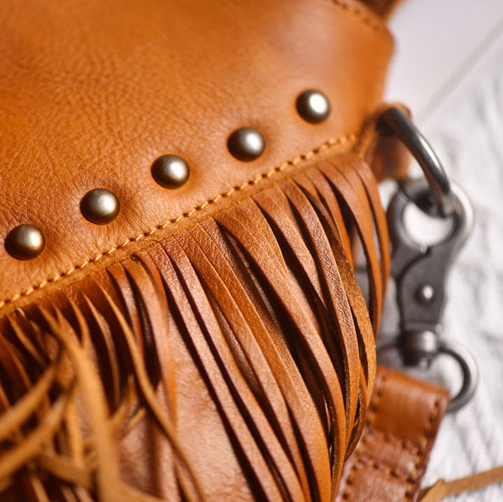 Genuine Leather Fringe Crossbody Bag for Women Boho Western Shoulder Purse with Studs