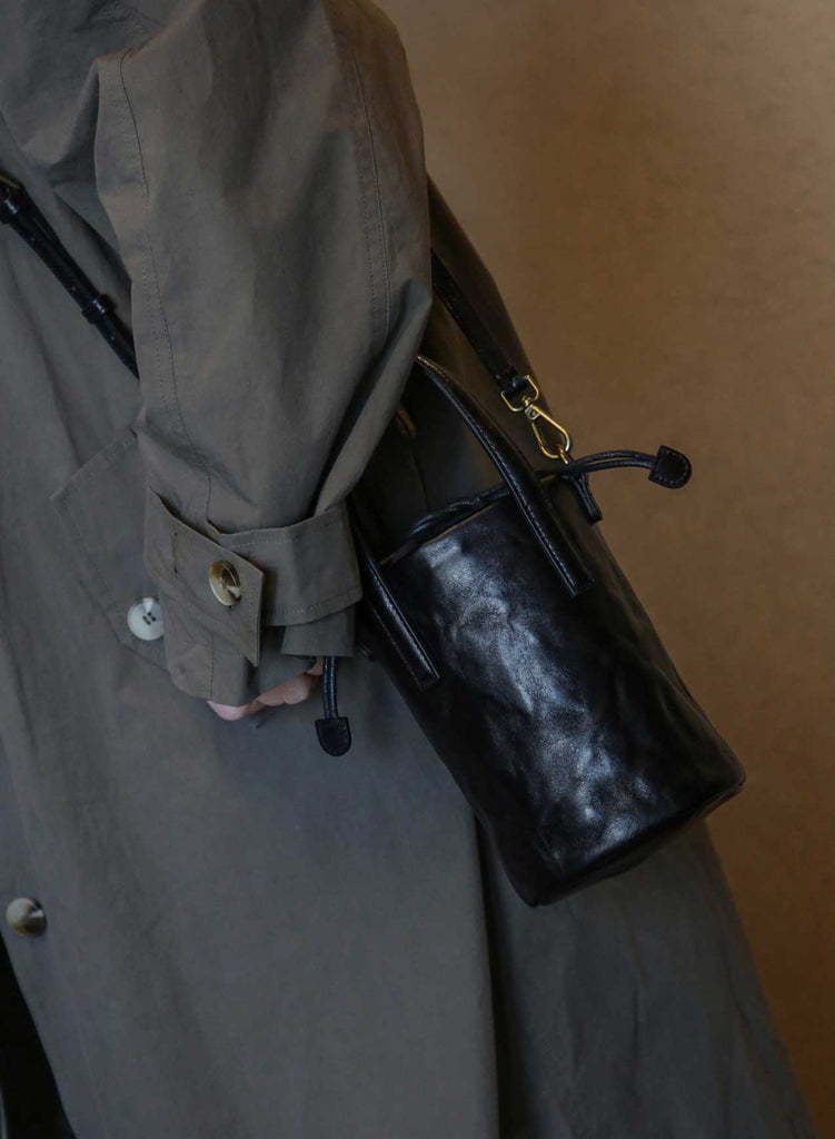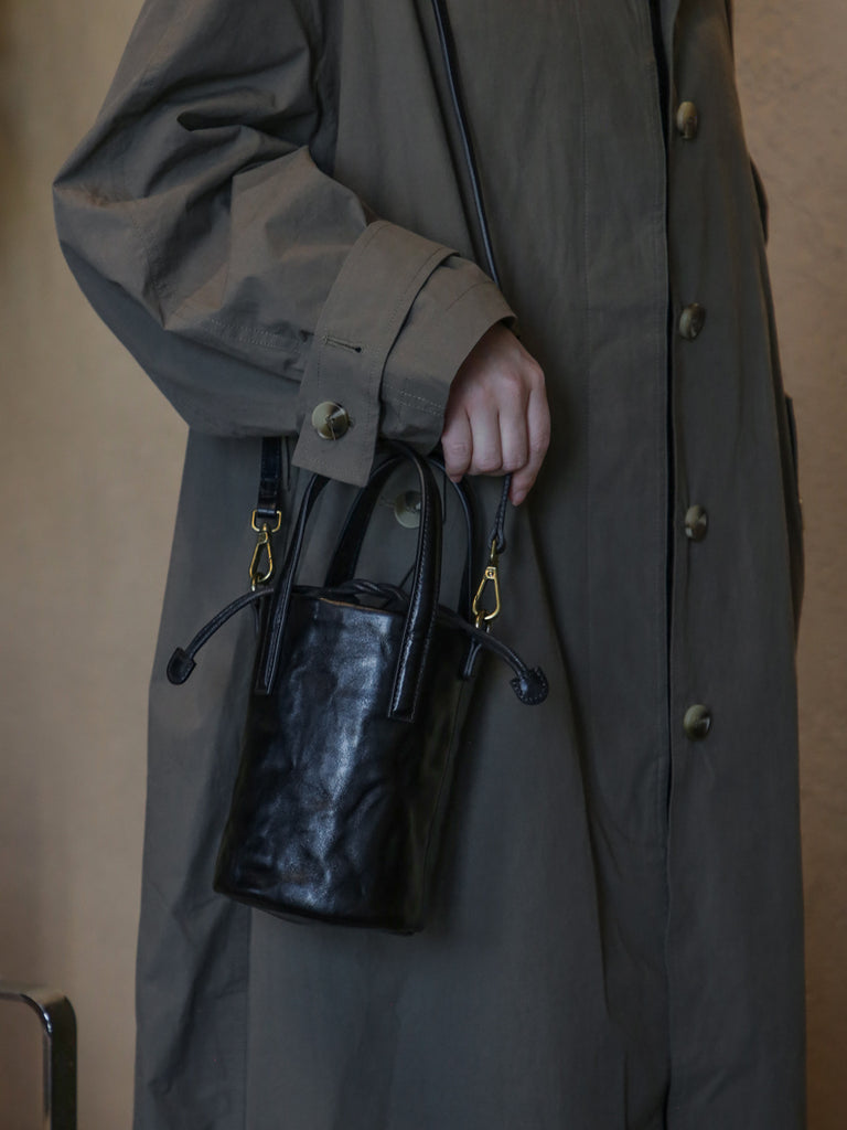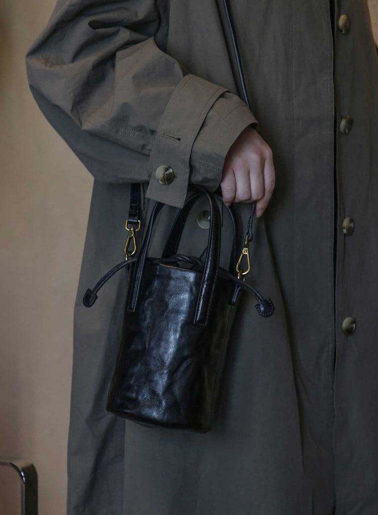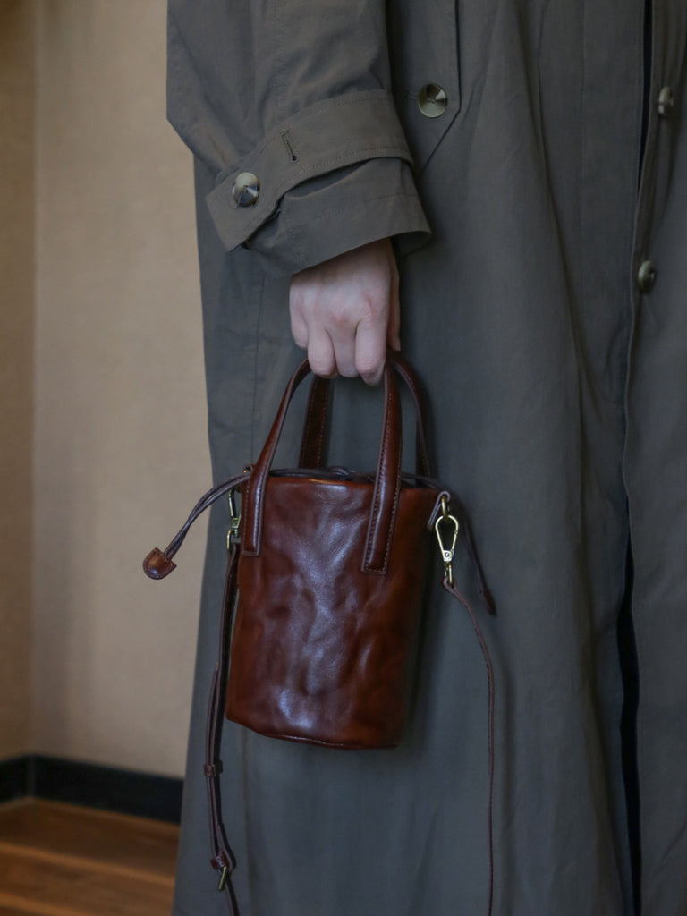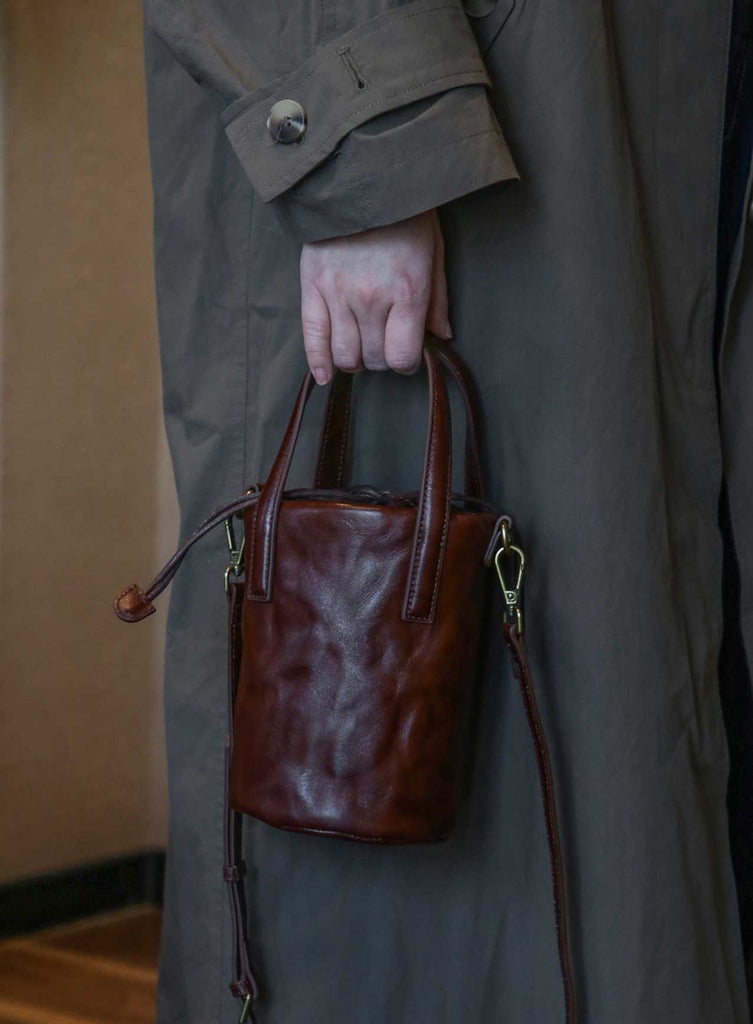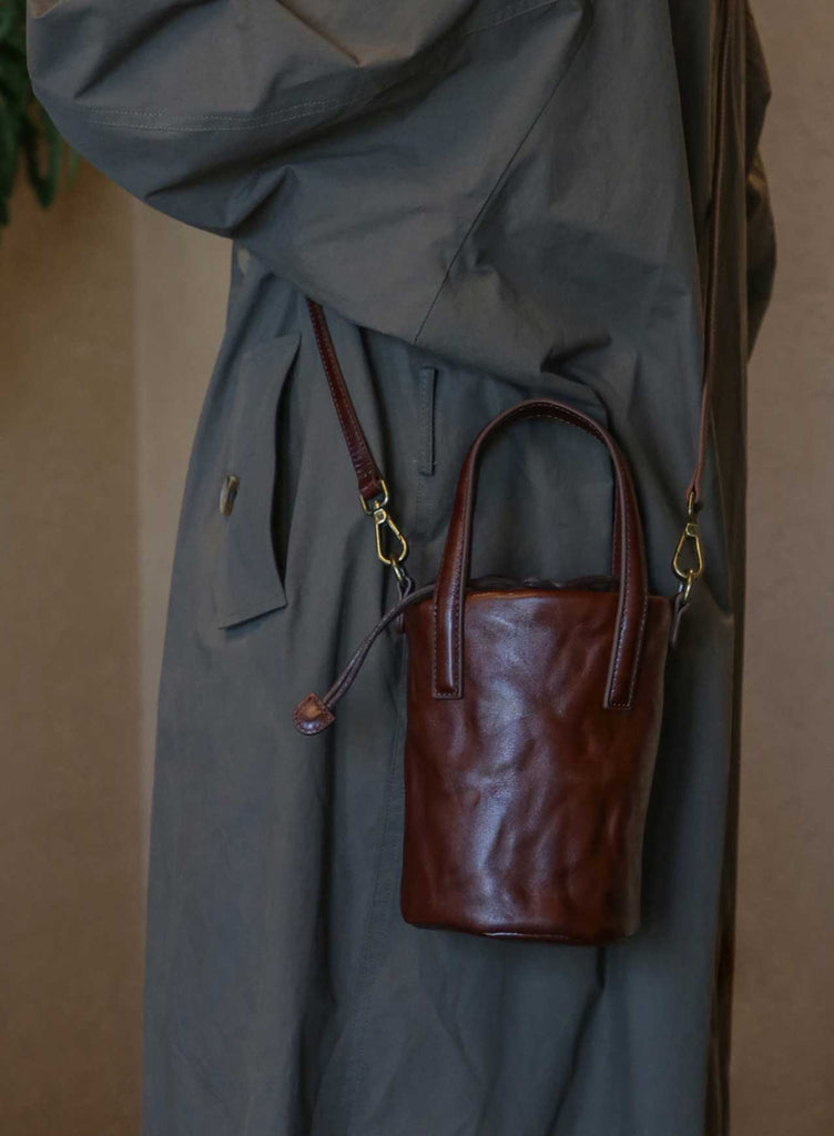 This mini leather bucket bag features a timeless vintage look with a natural textured finish. Made from vegetable-tanned top-grain cowhide, it offers a soft yet structured feel for everyday use.