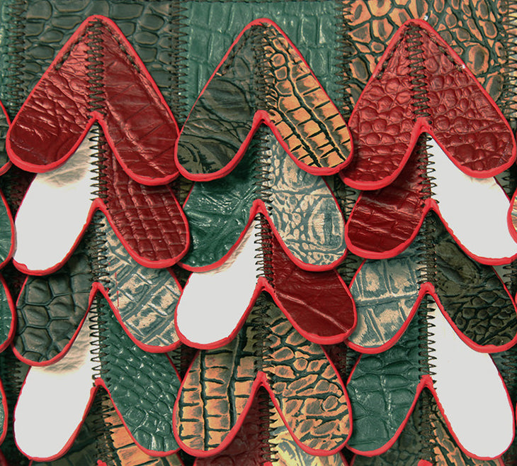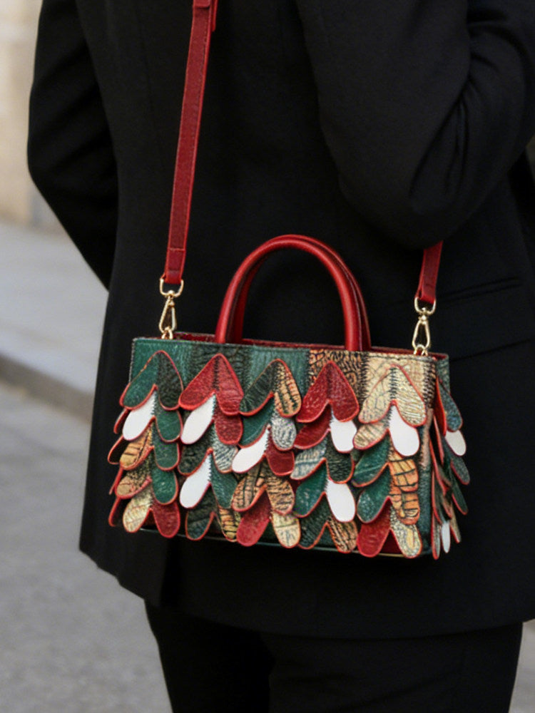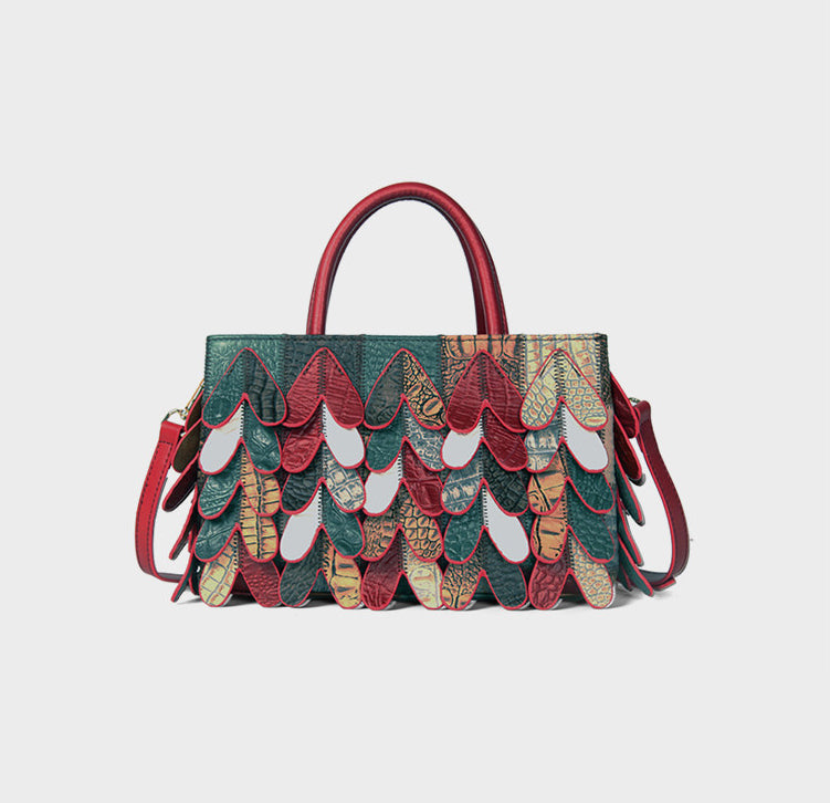 This bohemian-style leather handbag features a unique patchwork design crafted from genuine top-grain cowhide. The mix of colors adds a bold, artistic touch to any outfit.