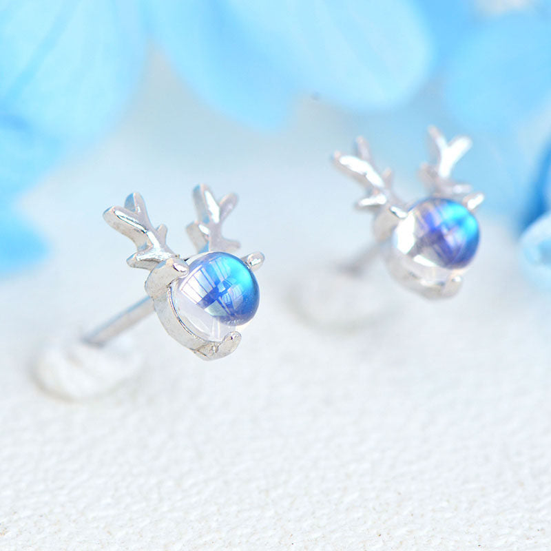 These delicate stud earrings are crafted from silver with white gold plating, featuring a glowing blue moonstone set in a charming deer head design. The antler silhouette adds a whimsical, nature-inspired touch while keeping the look minimal and elegant.