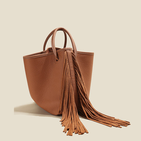 This stylish tassel bucket bag is crafted from genuine top-layer cow .