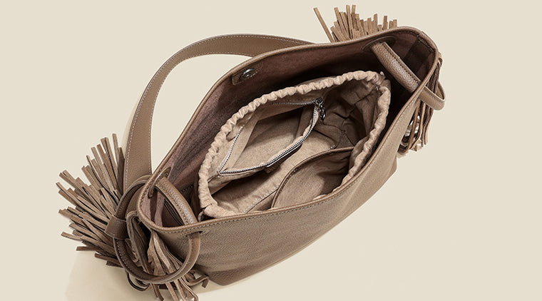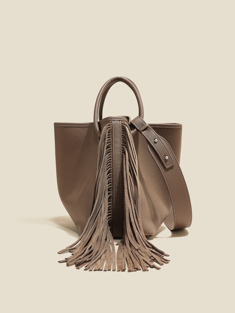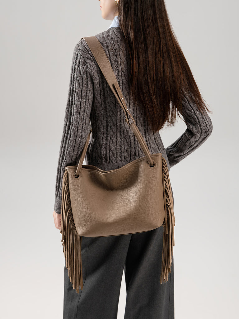 This stylish tassel bucket bag is crafted from genuine top-layer cowhide, offering a soft, luxurious feel with natural grain texture. The long leather fringe adds movement