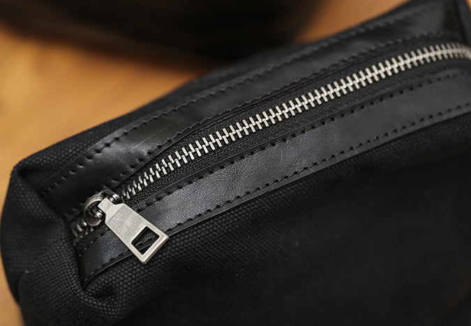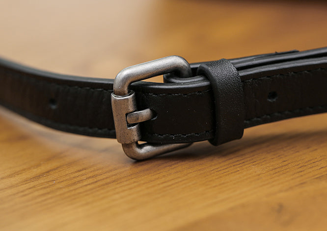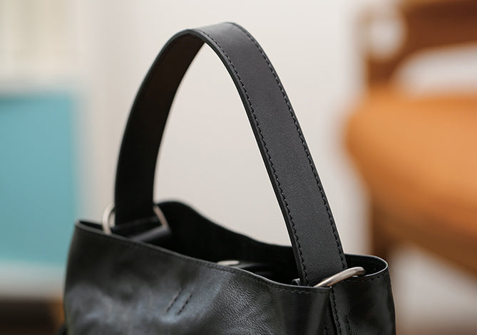 A compact black leather bucket bag crafted from vegetable-tanned full grain leather with a naturally textured finish.