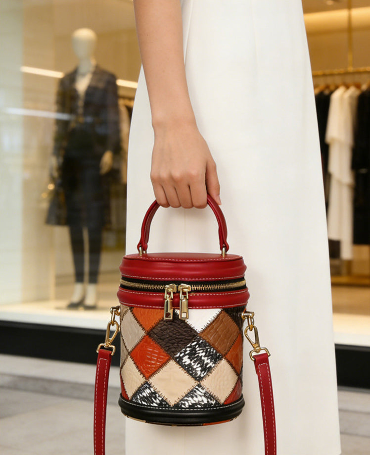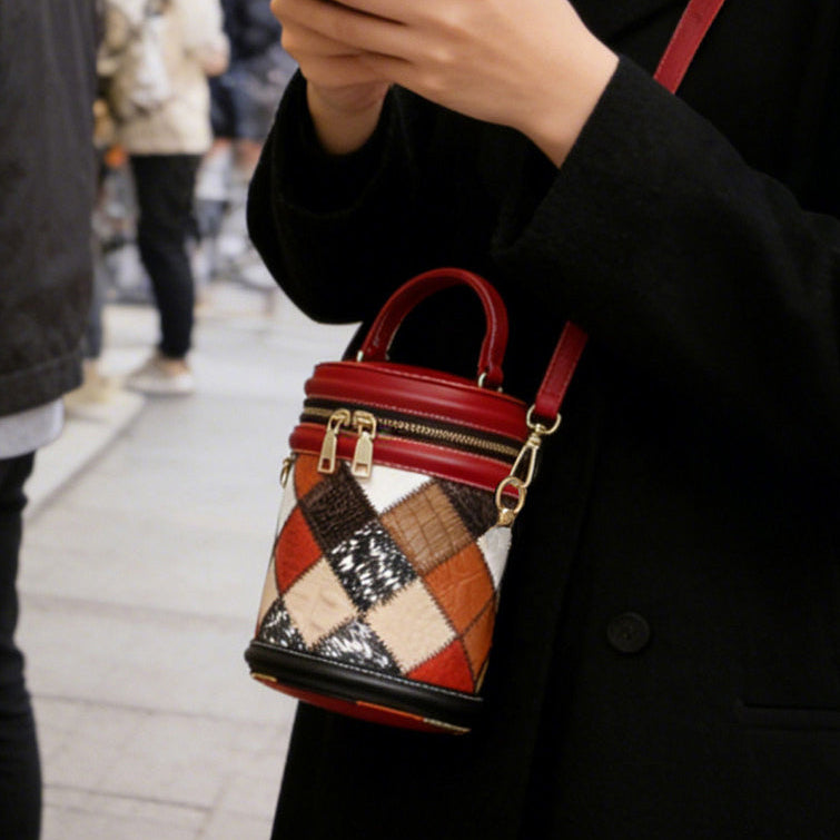 Boho Patchwork Leather Bucket Bag for Women Mini Crossbody Top Handle Purse