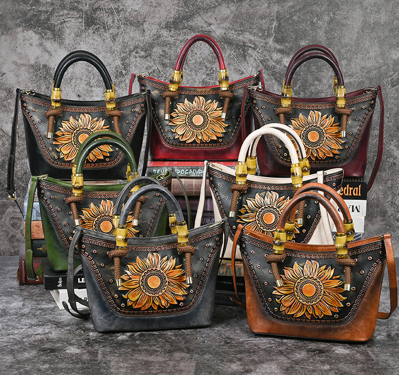 Women's Retro Genuine Leather Embossed Tote Bag Sunflower Pattern Top Handle Crossbody Purse