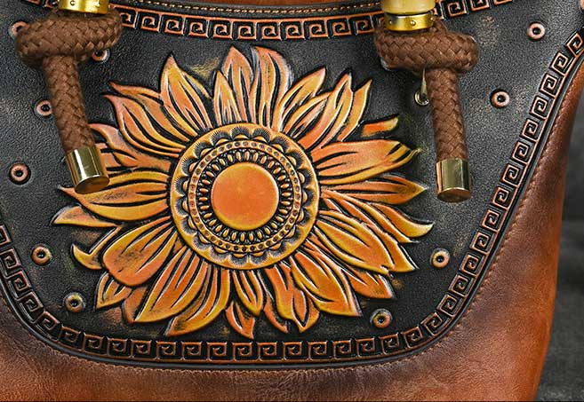 Crafted from premium top-layer cowhide leather, it features a handcrafted embossed sunflower pattern that radiates warmth and artistry.