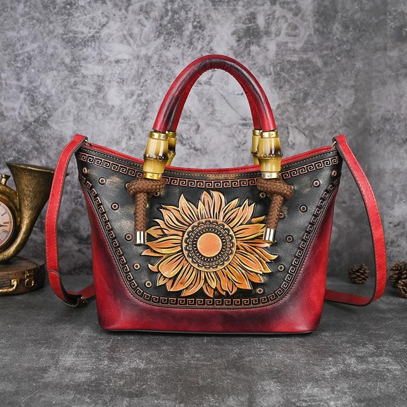 Add a touch of vintage charm to your style with this Sunflower Embossed Genuine Leather Handbag.